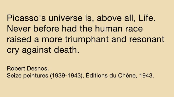 [3] Robert Desnos, citas procedentes de la introducción de Seize Peintures (1939-1943), citadas por Peter Read en Cahier Pablo Picasso, Éditions L’Herne, 2014, p. 288.