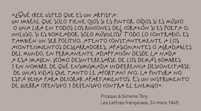 Se lo dijo claramente a la periodista y novelista Simone Téry (que había sido corresponsal de la guerra civil española en el bando republicano) en Les Lettres françaises del 24 de marzo de 1945, en un artículo titulado «Picasso n’est pas officier dans l’Armée française» («Picasso no es oficial del ejército francés»). «¿Qué cree usted que es un artista: un imbécil que solo tiene ojos si es pintor, oídos si es músico o una lira en todos los rincones del corazón si es poeta o, incluso, si es boxeador, solo músculos? Todo lo contrario, es también un ser político, atento constantemente a los acontecimientos desgarradores, apasionantes o agradables del mundo, en permanente adaptación desde la nada a esa imagen. ¡Cómo desinteresarse de los demás hombres y en nombre de qué ensimismada indiferencia desconectarse de unas vidas que tanto le aportan! No, la pintura no está hecha para decorar apartamentos. Es un instrumento de guerra ofensivo y defensivo contra el enemigo».[2]