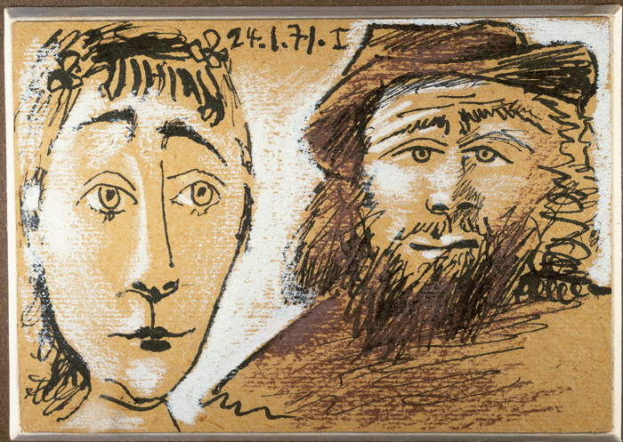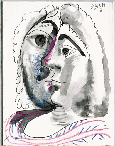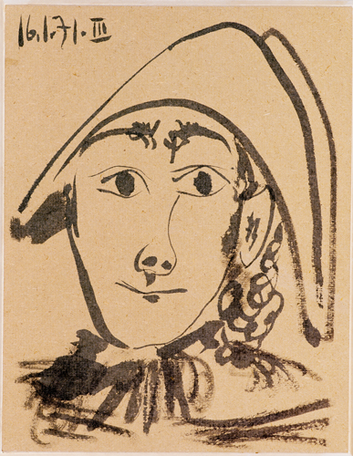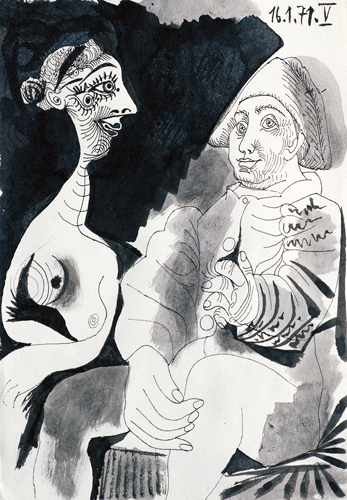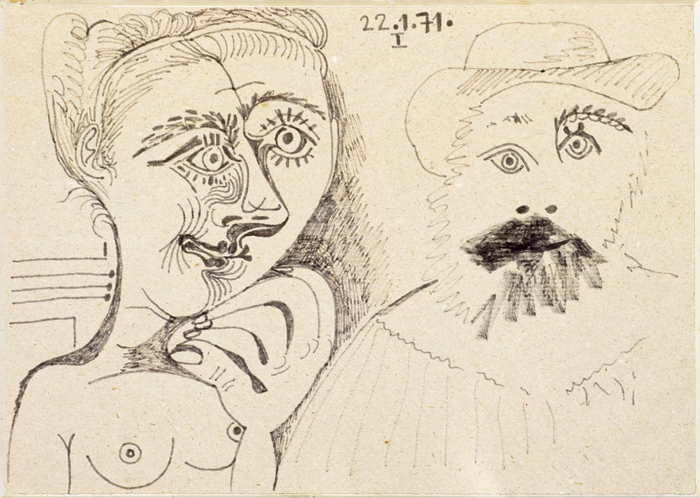 Cette « dernière période » fut longtemps méprisée des critiques comme des historiens, jusqu’à récemment ou son analyse plus nuancée montre à quel point elle fut aussi pour lui un éternel recommencement, une cure de rajeunissement et de vitalité, un retour aux sources, aux premières expériences sensorielles, inédites et jubilatoires. Cette série est un condensé, une sorte de conclusion des thèmes qui lui sont chers, de ses sources d’inspiration, de sa trajectoire personnelle et artistique. Certains personnages se schématisent et perdent de leur substance, d’autres, au contraire, faits de gros traits et de couleurs, envahissent l’espace du papier. Ses nus sont simples et certains sont dénués des tourments de la passion. À travers ses modèles, l’artiste se révèle un portraitiste étonnant, « divagant à la poursuite irraisonnée d’un portrait de la peinture que rien n’achève ni n’éteint », comme l’écrit Anne Baldassari dans le catalogue de l’exposition Picasso et les Maîtres. Le noir et le blanc structurent l’espace, tandis que les couleurs éclatantes annihilent le cadre avec une totale liberté de style. On apprécie les lignes lumineuses et aériennes, jusqu’au 4 février, date à laquelle Picasso a cessé la série. Comme le mot fin termine un film, il clôt ici avec la date, écrite trois fois au verso du dernier dessin.